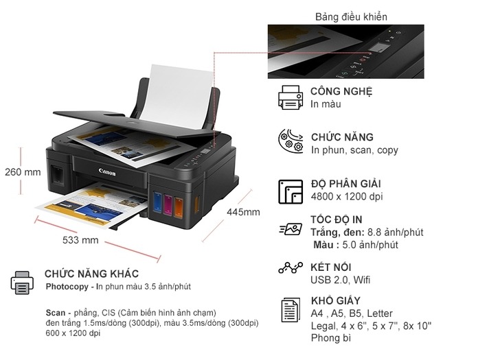 - Điểm nổi bật của Canon G3010 là độ phân giải lên đến 4800 x 1200 dpi, cho bản in sắc nét, rõ ràng và màu sắc sống động. Máy hỗ trợ nhiều khổ giấy khác nhau như A4, A5, B5, Letter, Legal, DL Envelope…, đáp ứng linh hoạt nhu cầu in ấn tài liệu và hình ảnh.